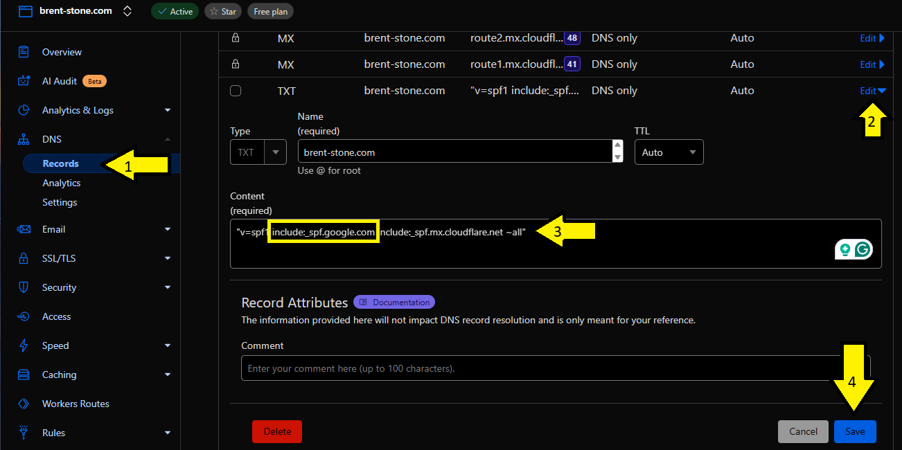 mx.cloudflare.netalias isn't what's originally shown in the TXT record automatically created by cloudflare, make sure to keep whatever the current alias is instead of replacing it. Simply add theinclude:_spf.google.comReplace the value with the following.